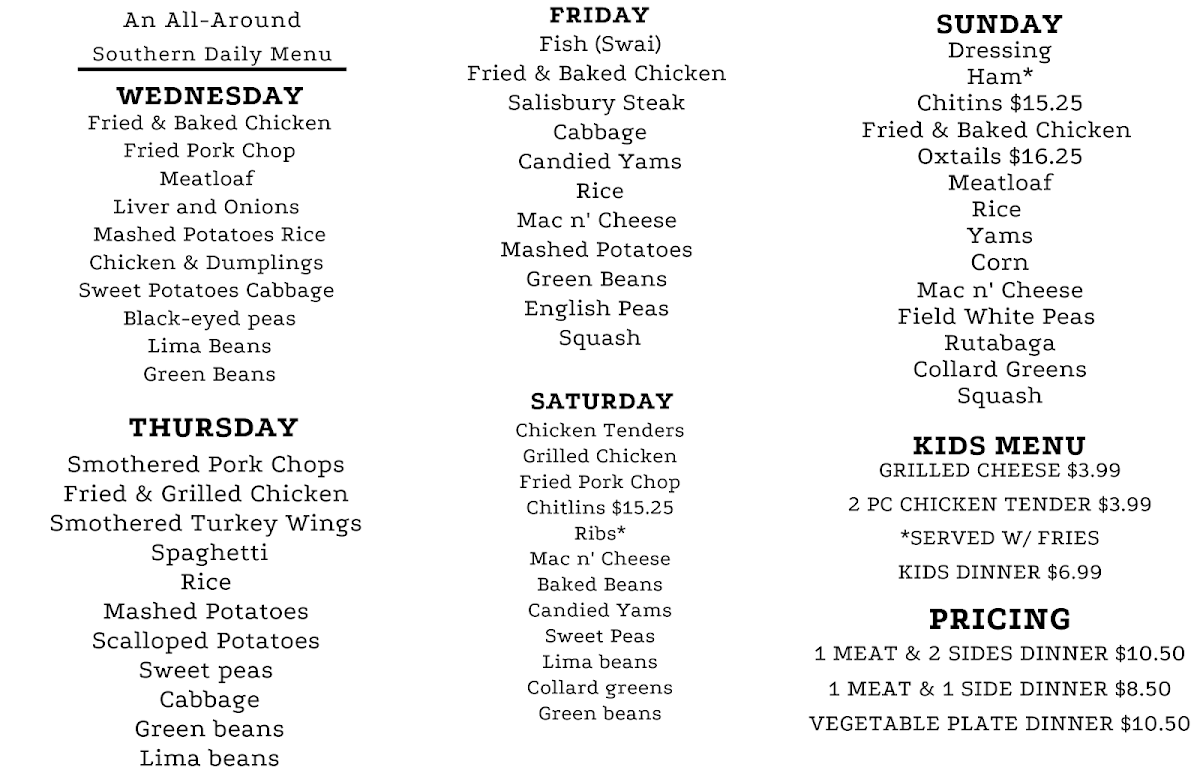 The menu showcases a variety of beloved Southern classics, including liver with rich onion gravy, succulent fried chicken, and hearty chicken and dumplings, all crafted with love and tradition. Customer reviews highlight the generous portion sizes and the nostalgic flavors that transport you back to momma's kitchen. Meals are thoughtfully paired with delectable sides like green beans, cabbage, and crispy fried cornbread, making each dish a celebration of culinary heritage.